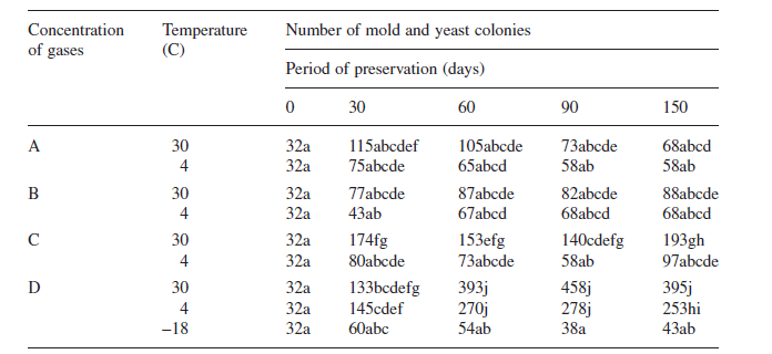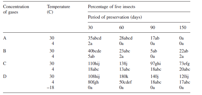 مورد A دارای % 85 CO2  به همراه %3   O2  به مدت 30 و 60 و 90 و 150 روز دردمای 30 و 4 درجه سانتی گراد بررسی شده است.  در دمای 4 درجه سانتی گراد بعد از 30 روز تنها 2 % رشد حشرات دیده می شود ولی در روزهای 60 و 90 و 150 روز بطور کامل رشد حشرات متوقف می شود همچنین در دمای 30 درجه سانتی گراد در مدت 30 روز در حدود 25% در 60 روز حدود 28% و در 90 روز حدود 17% و پس از گذشت 150 روز میزان تکثیر حشرات 0% می شود.