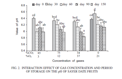 شکل 2 نشان دهنده تیمار خرما با درصد های 85، 75، 34 و 0 با کربن دی اکسید و همچنین 3، 12، 37 و 21 با اکسیژن در زمان های 0، 30 ، 60 ، 90 و 150 روز مورد بررسی قرار داده است. pH در بالاترین CO2 و کمترین O2 بین 6 تا 6.4 می باشد و با شرایط که CO2 صفر و O2 21 می باشد تقریبا یکسان است اما به مراتب وقتی میزان CO2 کاهش می یابد شرایط pH در محدوده اسیدی متمایل می گردد.