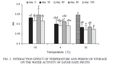 شکل 1 در دمای منفی 18 ، 4 و 30 درجه سانتی گراد در مدت روزهای 0، 30، 60، 90 و 150 روز مورد بررسی قرار گرفته است. در این نمودارها هیچ گونه روش درمانی انجام نشده است. بیشترین میزان آب که توسط گوشته خرما ذخیره می شود درحالیکه در دمای 30 درجه سانتی گراد میزان آب در داخل گوشته خرما به شدت کاهش می یابد. بر اساس این مطالعات خرماهایی که تیمار شده است با کربن دی اکسید و اکسیژن هیسچ گونه تاثیر در فعالیت آب در گوشته خرما ندارد و این دو پارامتر باعث افزایش و کاهش رطوبت در گوشته خرما نمی شود.
