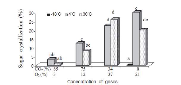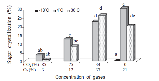 تاثیر بررسی دما و غلظت گاز بر روی کریستال های شکر خرما سایر مورد برسی قرار گرفته شده است.حداقل کریستال مشاهده شده در دمای منفی 18 درجه سانتی گراد می باشد و در مرحله بعد مربوط به بسته های تیمار شده با 85% CO2 + 3% O2 + 12% N2  و ذخیره در دمای 30 درجه کمترین میزان شکرک خرما مشاهده شده است. بنابراین شکرک خرما در دماهای بالا و تیمار با کربن دی اکسید بالا شاهد کاهش شکرک خرما می باشیم.